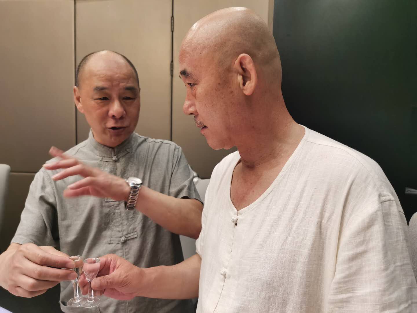 “委員長(zhǎng)”蔣介石扮演者韓英群先生(右)與公司釀酒大師陳靖余先生(左)品酒論道